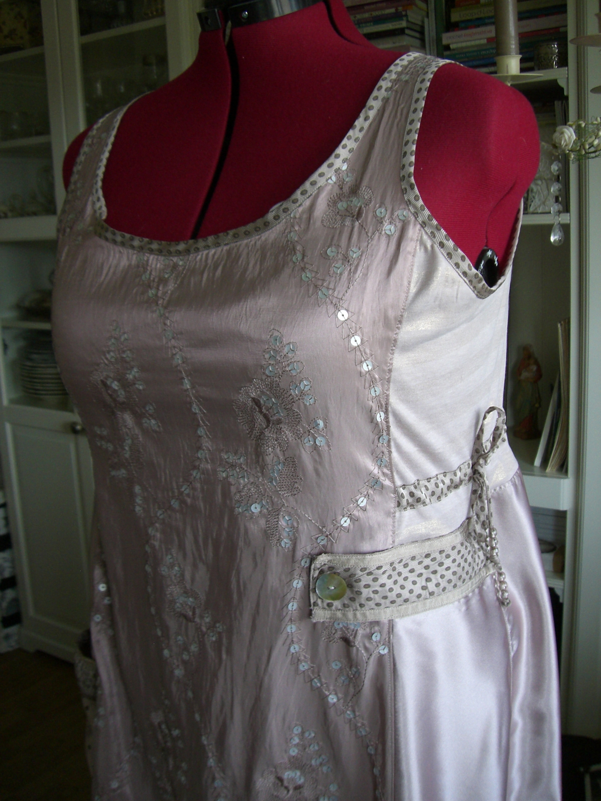 Taften er lett skrukket og det gir et lidt tøfft preg, på tross av pajlettene og broderiene...